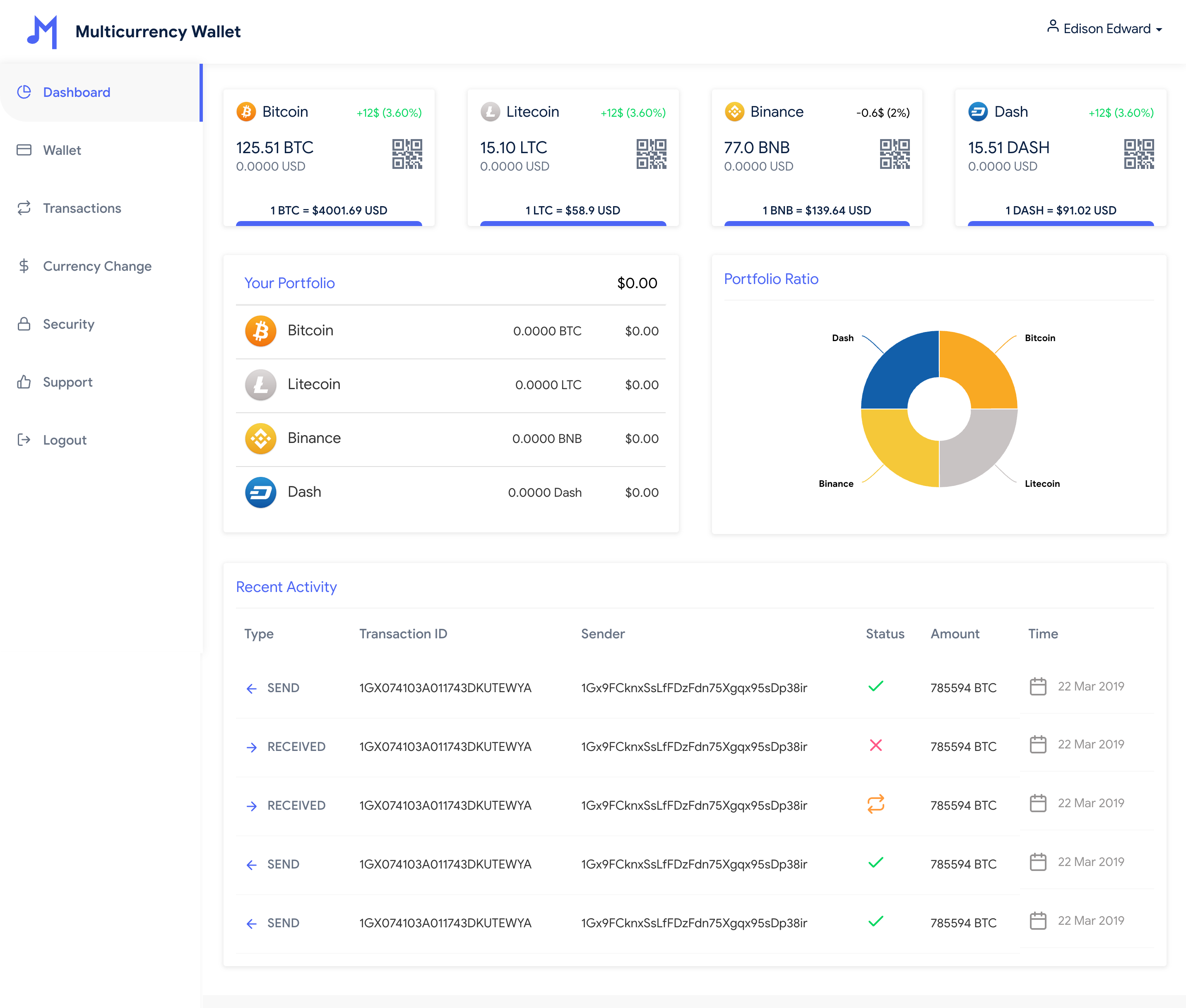 We develop multicurrency wallets that are compatible and support almost any type of coins. After all, when it is multicurrency, compatibility is the main focus. Here are some well-known coins that our wallet supports - Ripple, Bitcoin, Ethereum, Bitcoin Cash, Stellar and Litecoin.